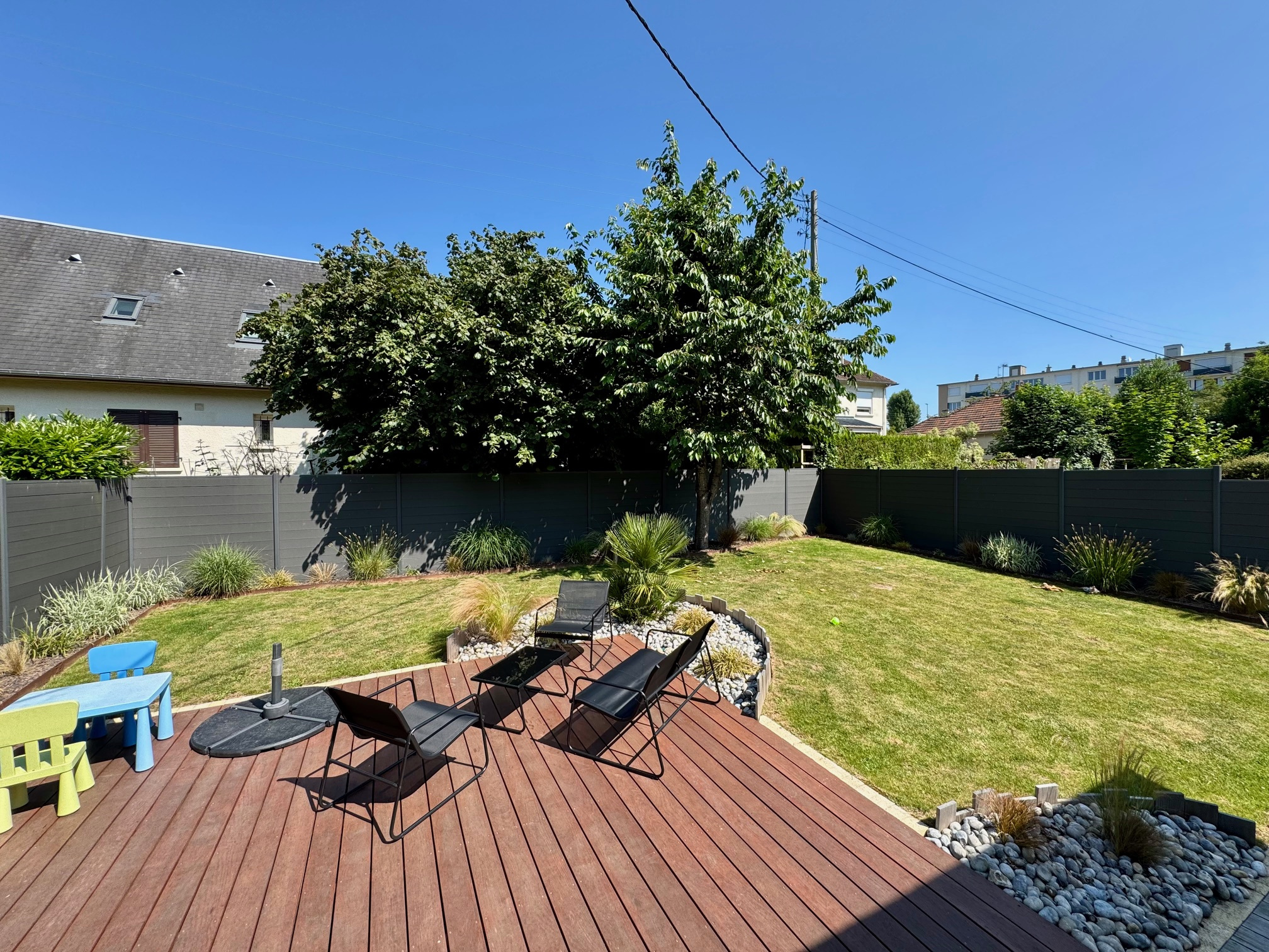 Le jardin clos et paysagé se trouve à l’opposé de le la rue, il est agrémenté d’une belle terrasse en bois exotique de 40m2 ensoléillée.