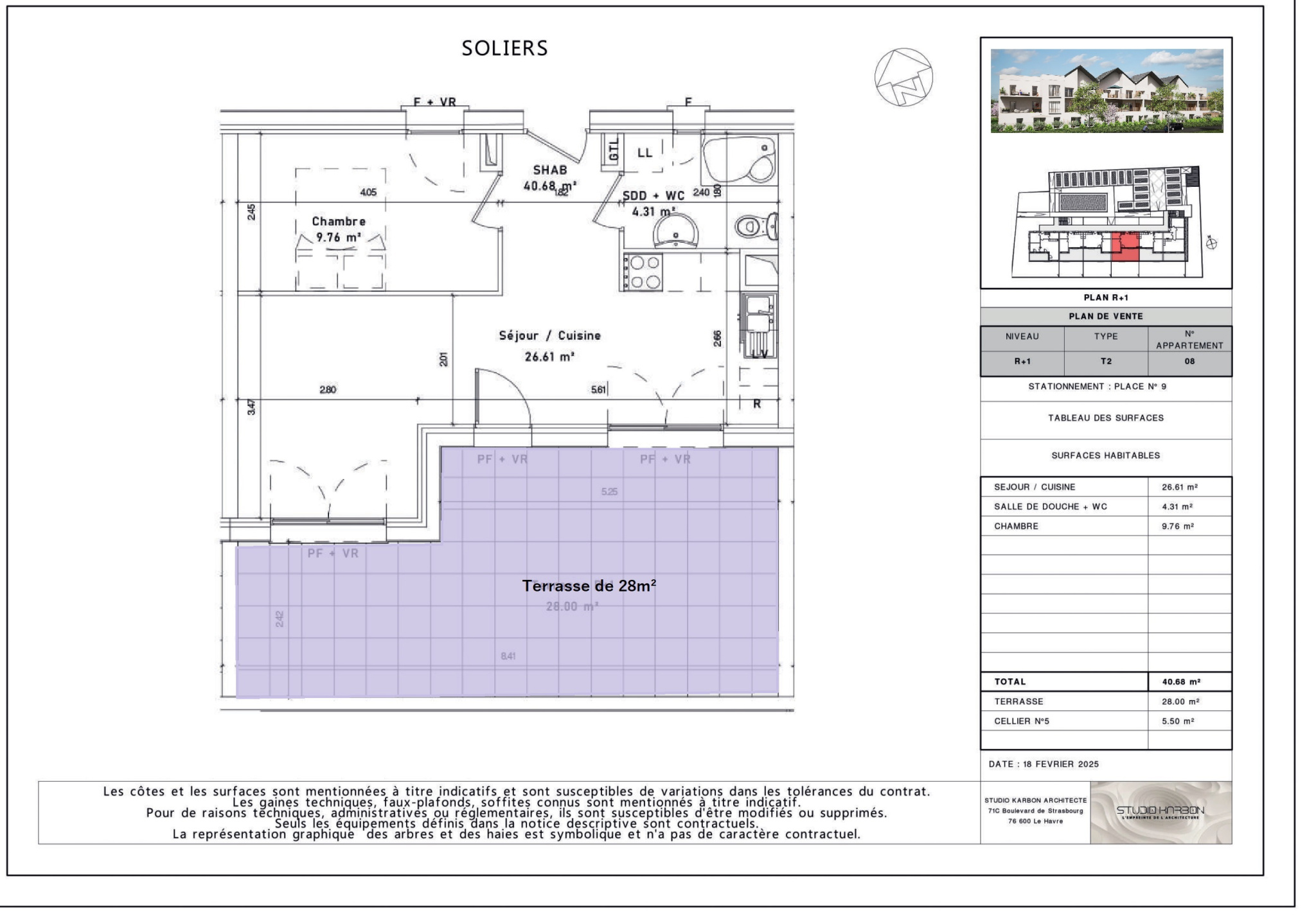 Il se compose d’une entrée avec placard, d’une pièce de vie principale de 18.50m2 avec cuisine ouverte, puis une chambre de 11.50m2, d’une salle d’eau et d’un wc .