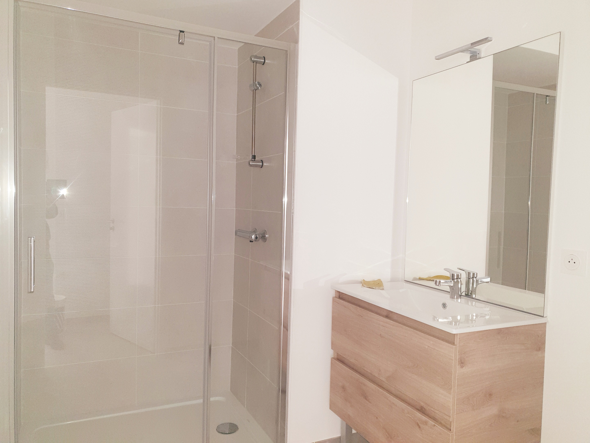 Il se composait d’une entrée avec un grand rangement, un séjour avec cuisine ouverte, donnat sur un balcon de 7.5m2, une chambre avec placard de rangement, une salle d’eau avec WC.