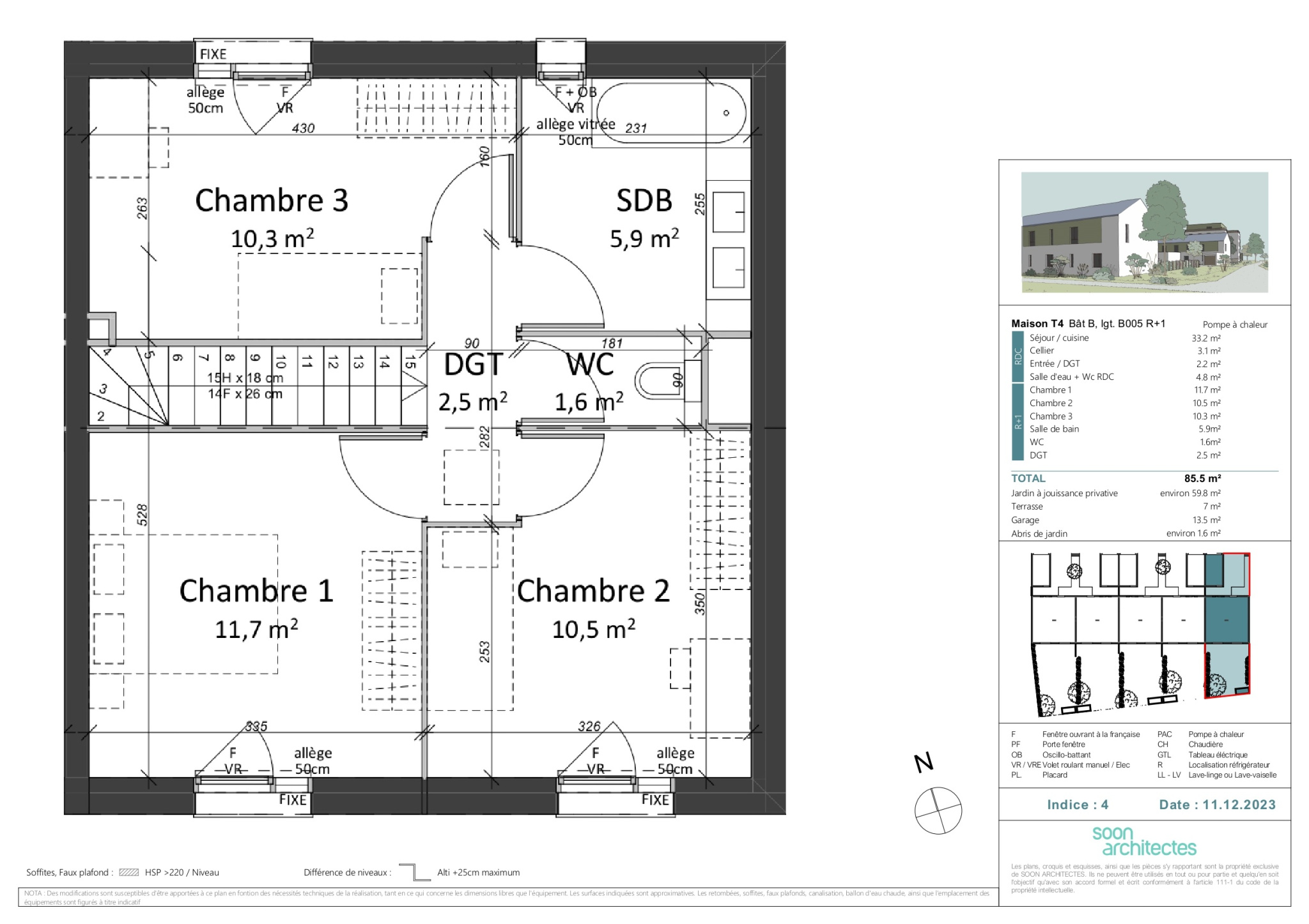 Elle se compose d’une entrée, un cellier,une salle d’eau, puis la pièce de vie de 33m2 ouverte sur le jardin arboré, engazonné et clos, et une terrasse déjà réalisée de 6m2, puis à l’étage 3 chambres (11m2-10m2- et 10m2), une autre pièce d’eau avec fenêtre.