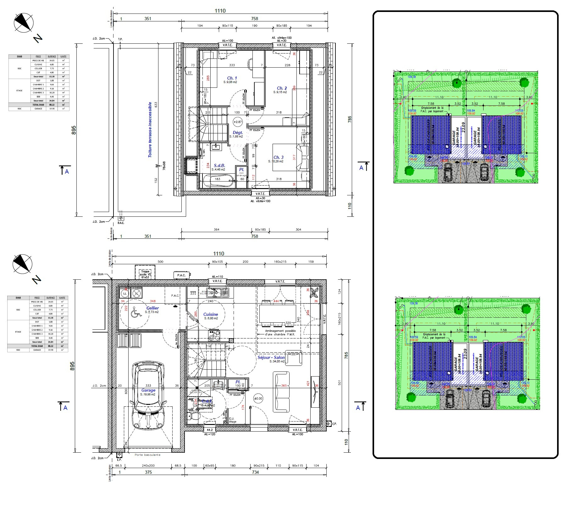 Cette maison de 88m2 bénéficiera d’une exposition parfaite (Sud et Ouest), 3 chambres, d’un jardin clos et arboré,garage et place de parkings privée devant l’entrée.