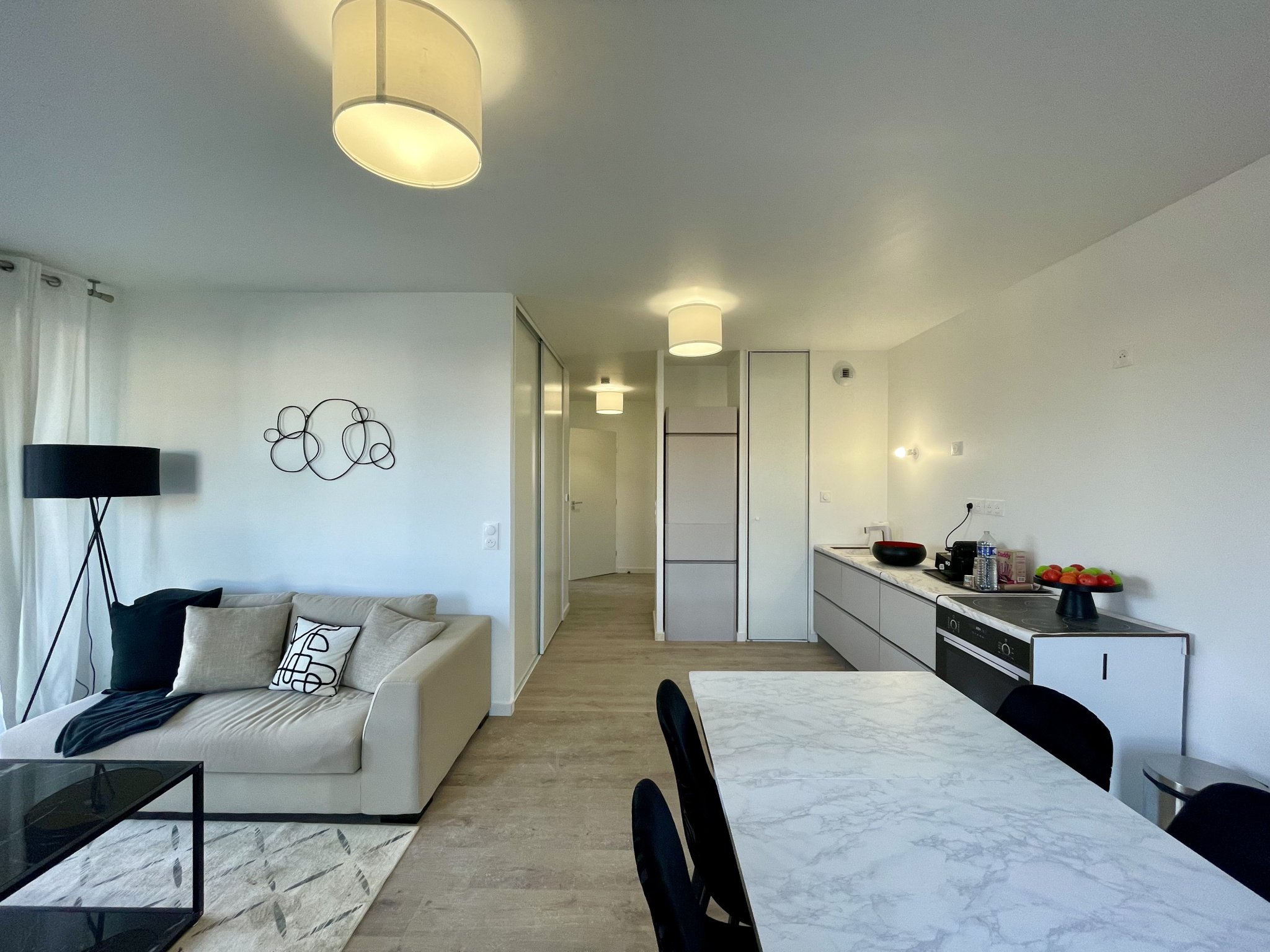 Ici,nous vous présentons un des plus bel appartement de la résidence, de type 2 Pièces offrant une pièce de vie de 18m2 ouverte sur sa loggia de 5m2 exposée plein sud, 1 chambre confortable, une salle d’eau avec douche à l’italliene sans marche, et un toilette indépendant,