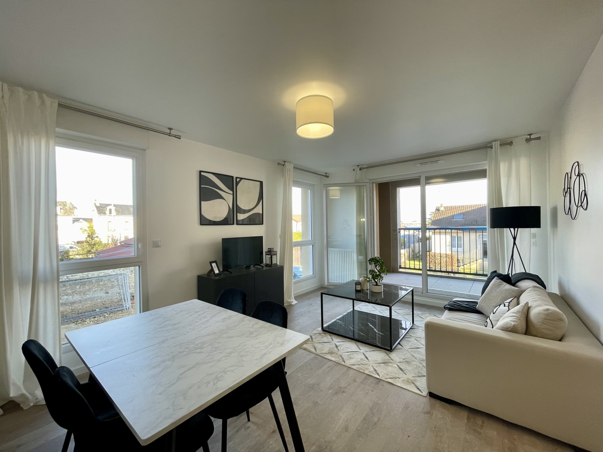 Une Pièce de vie principale de 30m2 ouverte sur le balcon de 15m2, une cuisine avec fenêtre porte febtere etacces au grand balcon, une chambre de 12m2 avec placard, une autre chambre de 10m2, puis une salle d’eau et wc indépendant