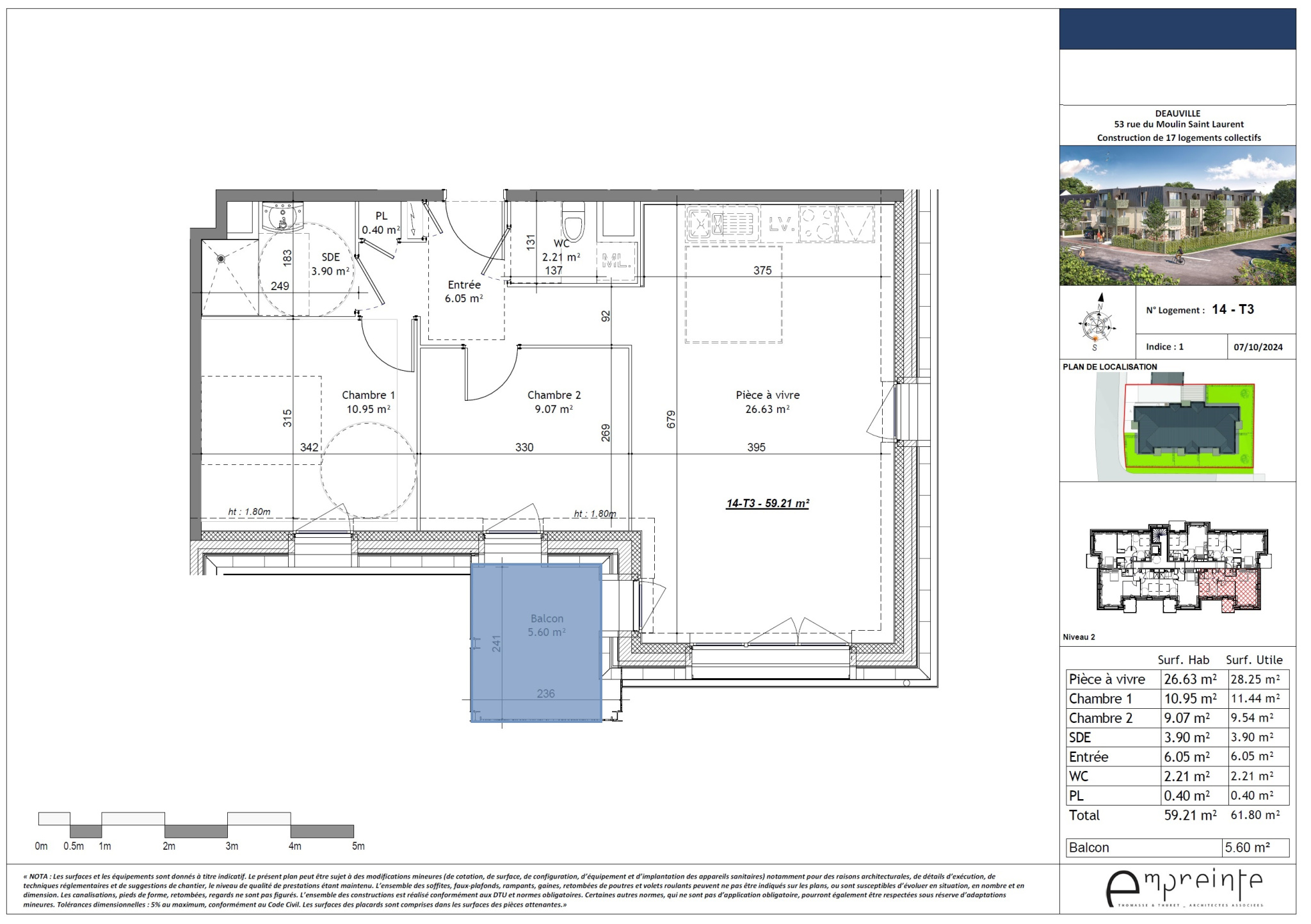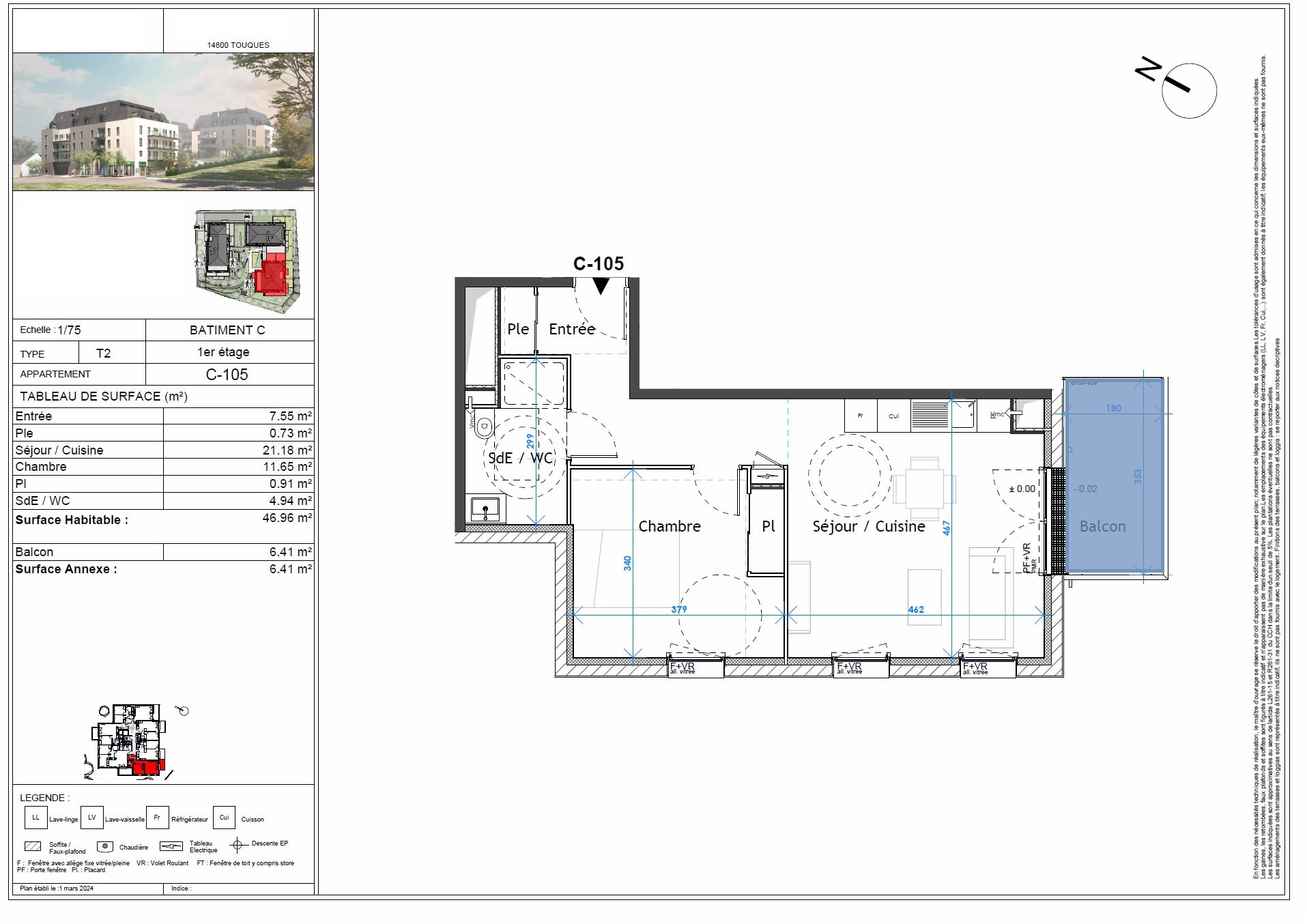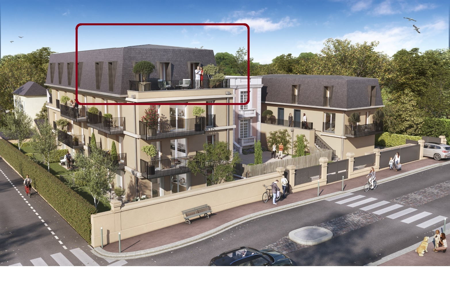 Ici, nous vous présentons au sein du bâtiment B, un appartement terrasse au dernier étage avec terrasse de 15m2, il se compose de 3Pièces en angle offrant de belels vues sur le centre ancien de Touques.