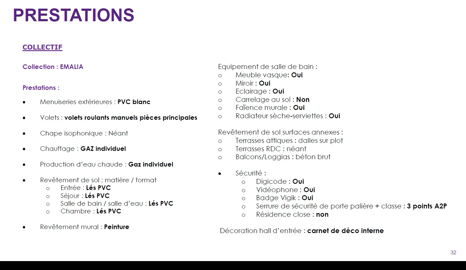 Cette résidence propose de belles prestations (volets roulants électriques,revetement de sol en carrellage 45*45 pour la pièce de vie principale,parquet dans les chambres, menuiseries avec volets roulants électriques, bac à douche de grande taille (80*110cm) , salle d’eau aménagée ,vidéophone controlant les accès).