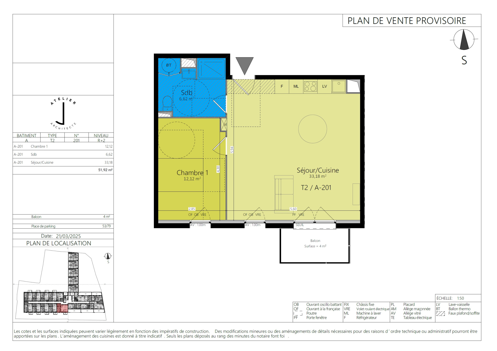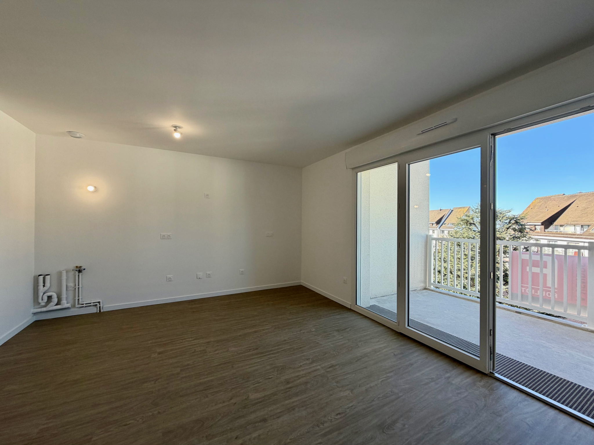 Entrée, une pièce de vie principale de 33m2 avec cuisine ouverte sur le balcon, une chambre de 12m2 puis une salle d’eau avec wc dans l’entrée.