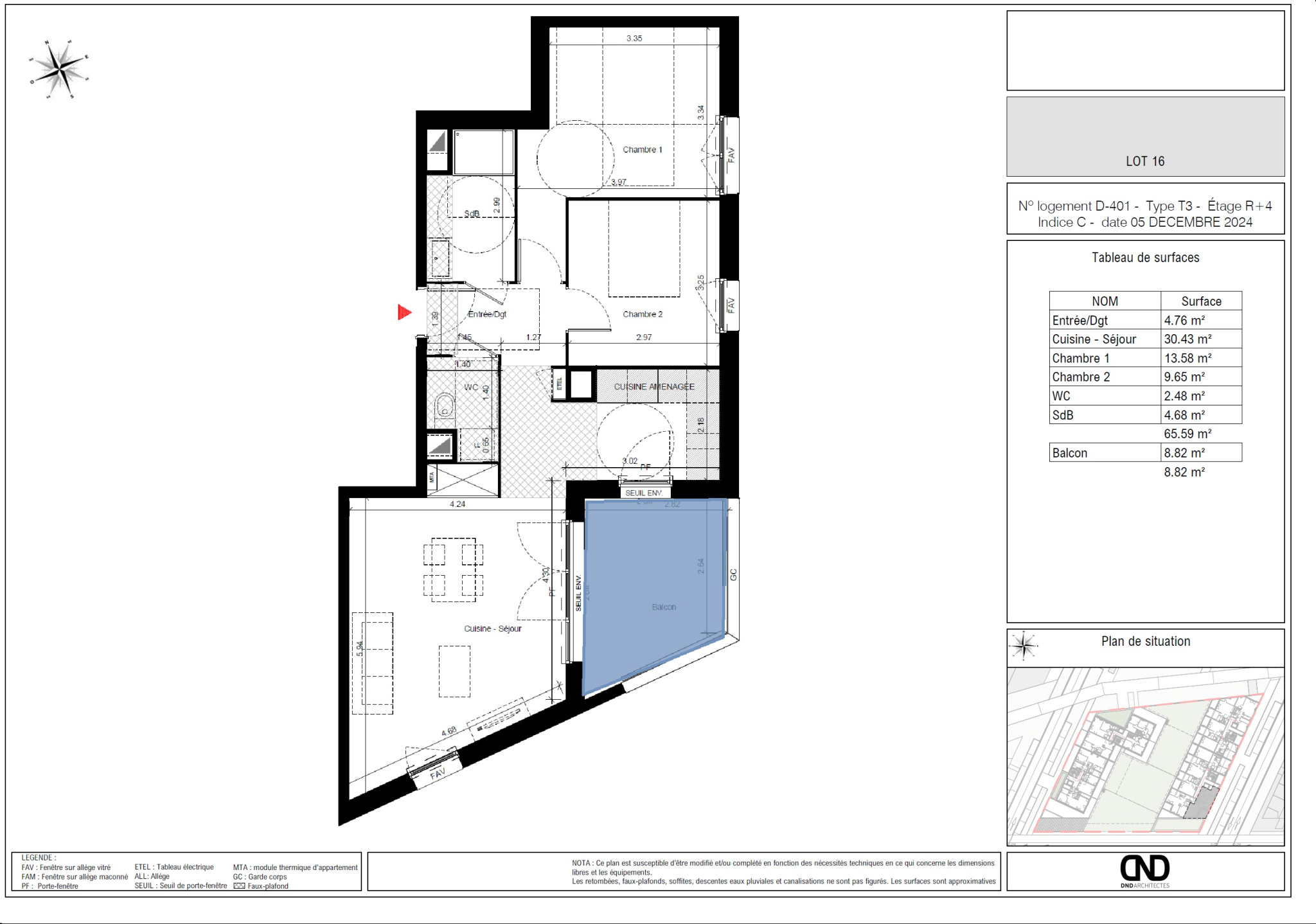 Cet Appartement proposera une pièce de vie principale avec cuisine aménagée de 30m2 ouverte sur le grand balcon de 8m2, puis 2 chambres de 13m2 et 9.65m2, une salle d’eau, et wc indépendant. Placard dans l’entrée .