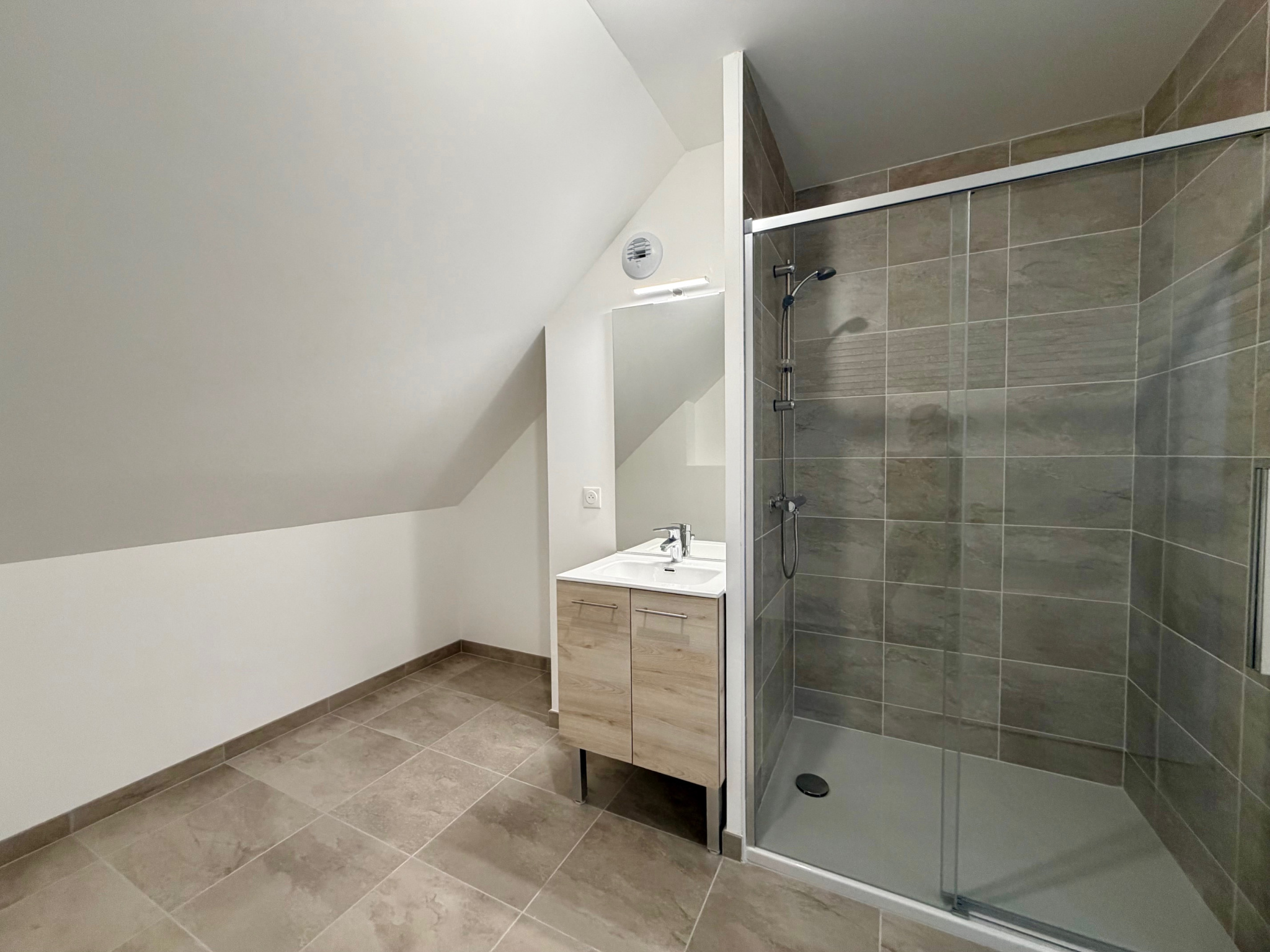 A l’étage : 2 autres chambres de plus de 20m2 au sol, toilettes, et salle d’eau avec fenetre de toit.