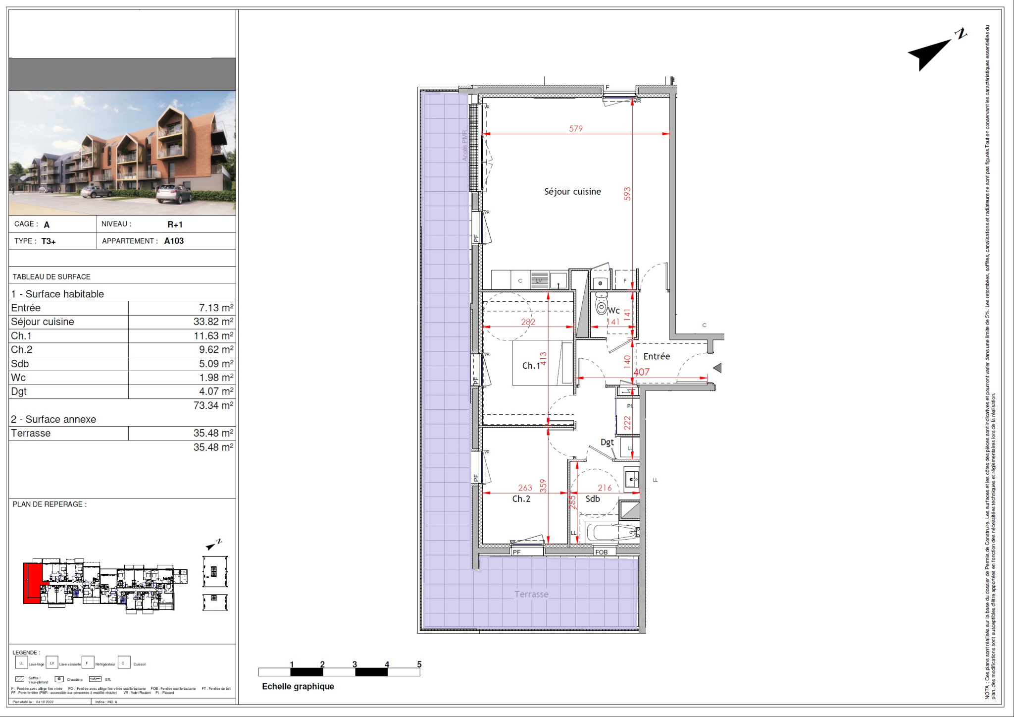 Ici, nous vous présentons au sein du bâtiment B, un appartement terrasse au dernier étage avec terrasse de 15m2, il se compose de 3Pièces en angle offrant de belels vues sur le centre ancien de Touques.